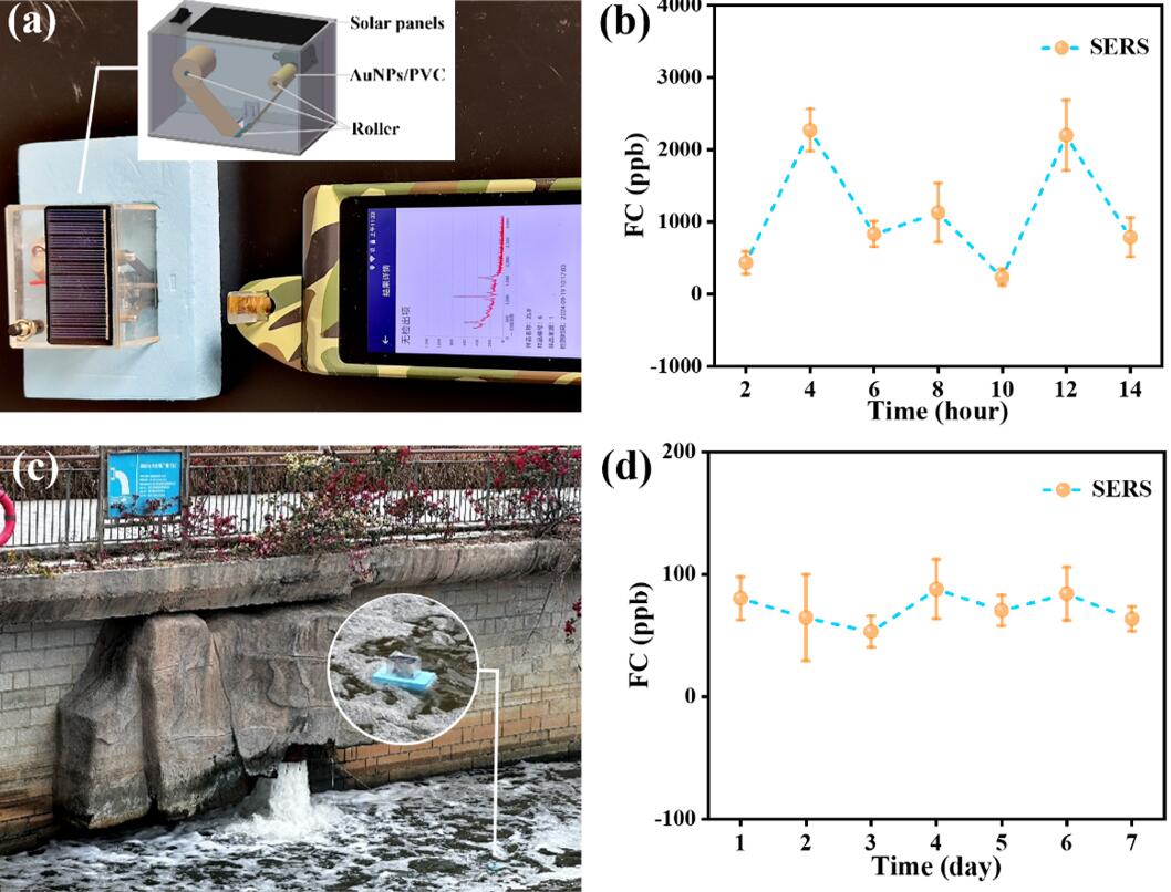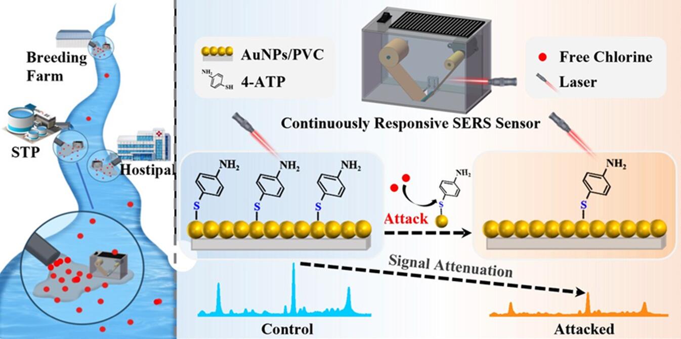 Rapid industrialization and urbanization have significantly increased wastewater discharge into natural water bodies, thereby emphasizing the critical importance ofprecise long-term pollutant monitoringat urban sewage outfalls to protect aquatic ecosystems. Free chlorine (FC), widely used in disinfection, poses significant ecological risks when over-discharged. However, achieving reliable long-term FC monitoringat discharge points remains a substantial challenge. In this study,we developed a continuously responsive surface-enhanced Raman scattering (SERS) sensor for long-term on-site FC monitoring.The sensor integrated a flexible SERS probe functionalized with 4-aminothiophenol (4-ATP) for selective FC detection, and acompact floating roller device for continuous signal acquisition. The sensor exhibited a low detection limit of 4.16 ppb and accurately quantified FC concentrations in real-world water samples, showcasinghigh sensitivity and reliability.Long-term deployment atsewage treatment plant (STP) outfalls further validated its robust monitoring capabilities under actual environmental conditions. This innovative SERS sensor offers a practical and accurate solution for long-term on-site FC monitoring, highlighting its potential as a scalable approach for environmental monitoring applications.?