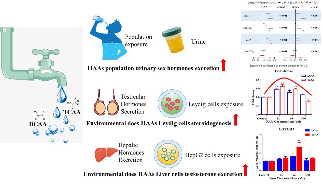 本研究结合人群流行病学数据和体外细胞暴露实验,系统开展了三氯乙酸(DCAA)和二氯乙酸(TCAA)两种典型HAAs的分泌干扰毒性。我们在449例男性人群的尿液中均检测到DCAA和TCAA(检出率100%),说明普通人群广泛暴露于低剂量的HAAs类消毒副产物,且发现环境剂量下的DCAA和TCAA与人群尿液中的性激素水平显著正相关;同时参考人群的HAAs真实暴露剂量,证实环境剂量下的HAAs暴露能够显著诱导睾丸间质细胞中的睾酮合成;在体外肝细胞暴露实验中发现,环境剂量下的HAAs抑制肝脏中的睾酮Ⅰ相分解代谢过程,而促进睾酮的肝脏Ⅱ相结合和Ⅲ相外排转运相代谢过程,从而影响睾酮的尿液排泄过程。本研究结果表明环境剂量的HAAs暴露也会对男性人群的内分泌具有干扰效应,并且证实对睾丸中睾酮的合成路径以及肝脏中的睾酮代谢路径具有双重干扰作用。本研究的尿液激素水平检测为饮用水中的消毒副产物的内分泌干扰健康风险评估提供一种新的无创评估方案。