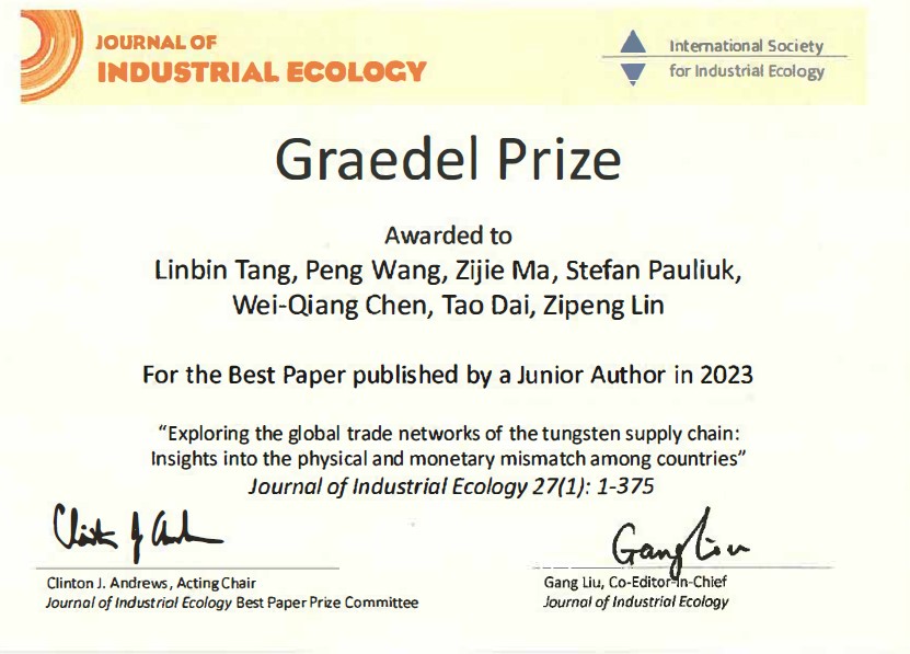 ????中国科学院城市环境研究所陈伟强科研团队成果《Exploring the global trade networks of the tungsten supply chain: Insights into the physical and monetary mismatch among countries》获Journal of Industrial Ecology(JIE)2023年度青年学者最佳论文奖(JIE Graedel Prize for best paper by junior author),是中国大陆研究团队首次获得这一奖项。JIE最佳论文奖自2013年起设立,以产业生态学先驱、美国工程院院士、耶鲁大学Thomas E. Graedel教授的名字命名,每年奖励两篇论文,其中由青年作者(Junior Author)和资深学者(Senior Author)领衔的论文各一篇。获奖论文由JIE编委会成员或奖项评委会成员提名,依据论文的专业价值(professional merit)、贡献(contribution)、展示质量(presentation quality)投票遴选,获奖者将获得国际产业生态学会(ISIE)的免费会员资格,并获得750美元的奖励,奖金由Nickel Institute、GE、A-1 Recycling、Raw Materials Group Stockholm、Martha Walters和AT&T赞助。