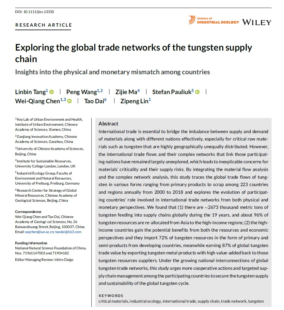 中国科学院城市环境所科研团队“关键金属钨供应链追踪”成果荣获2023年度产业生态学会会刊JIE最佳论文奖(Graedel Prize)