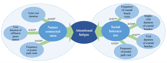 图2 自然联结与社交互动在自然接触促进注意力疲劳缓解的中介效应路径