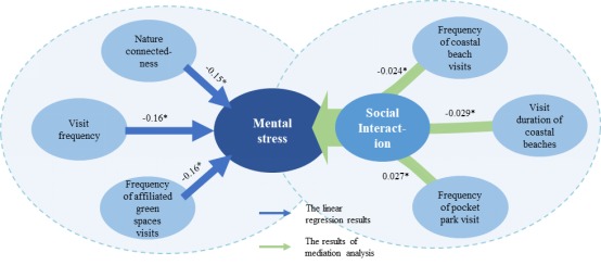 本研究以厦门市某科研机构作为研究对象,开展问卷调研实验。共收集问卷218份,其中有效问卷为171份。研究关注科研人员在附属绿地、口袋公园、综合公园、滨海沙滩等四类城市绿色空间进行游憩活动所产生的心理健康作用,揭示城市绿色空间改善科研人员心理健康的自然社会路径,探讨不同绿色空间类型对心理压力与注意力疲劳的作用差异。研究假设自然接触的提升能够促进个体的自然联结与社交互动,进而改善个体的心理健康。采用逐步检验法和bias-corrected bootstrap法对影响路径的中介效应进行检验。研究结果表明,对于科研人员,城市绿色空间的自然接触不仅对心理健康能产生直接的积极影响,还能通过自然联结与社交互动中介作用于个体的心理健康。小型绿色空间高频率的游憩活动不仅对压力缓解具有显著作用,还通过自然联结的中介缓解注意疲劳,而大型城市绿色空间主要通过社会互动促进个体的心理健康。