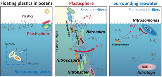 图2. 塑料际(固着模式)和水体(浮游模式)中微生物硝化过程的示意图。河口塑料际具有与周围海水不同的活跃硝化微生物。