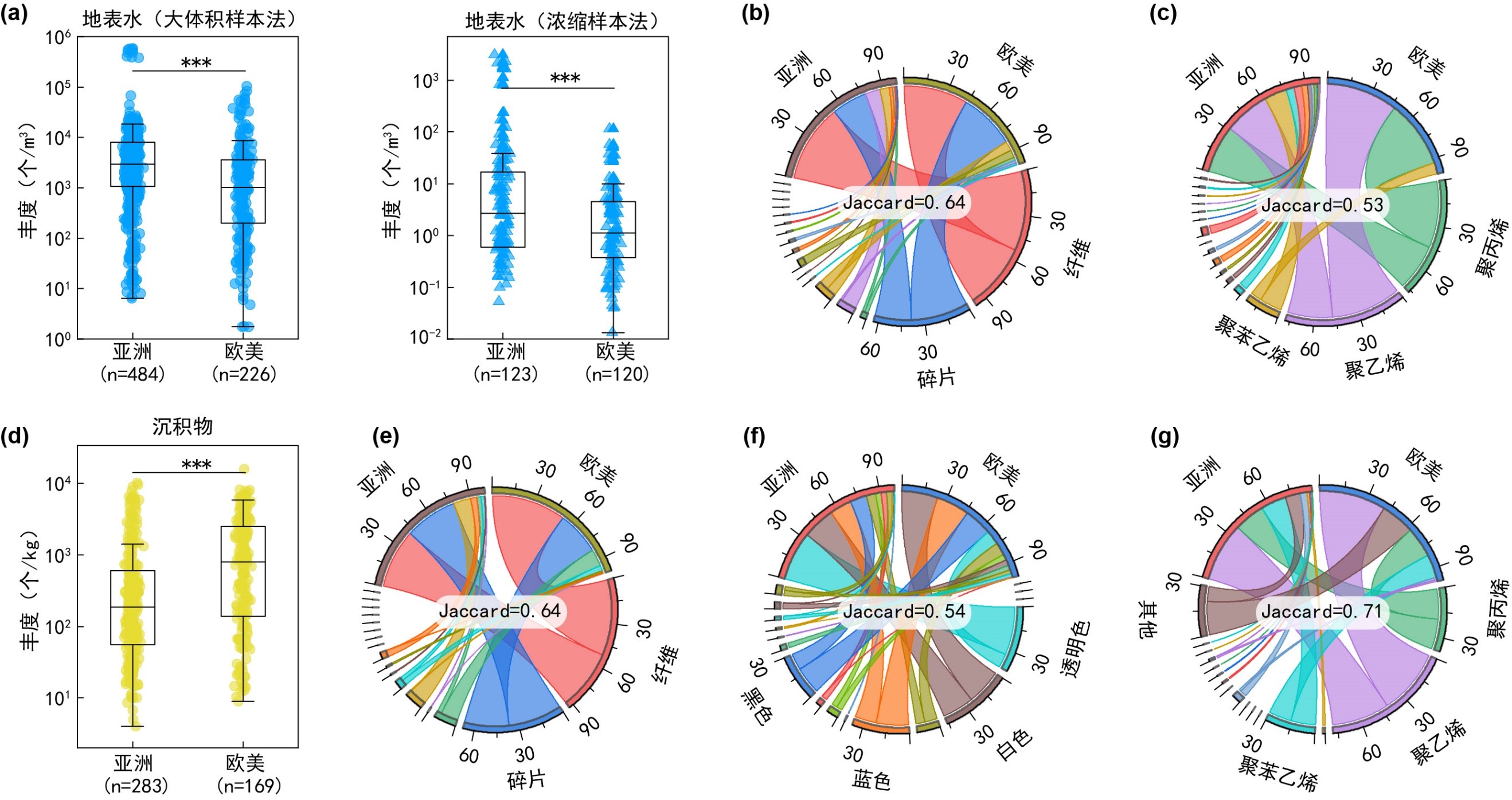 环境介质分组对比发现,河流沉积物微塑料污染差异与地表水不具有洲际对称。微塑料在河流沉积物中的污染也表现出洲际尺度差异,但其丰度、形态等特征差异格局与地表水不一致,亦称为不对称格局。一是,河流沉积物微塑料丰度中位数在欧美高达795个/千克,而在亚洲只有186个/千克,即欧美是亚洲的4.3倍(图3d);二是,纤维状在欧美河流沉积物中比在亚洲更具优势,而碎片状在亚洲河流沉积物比欧美更具优势(图3e)。丰度和形状属于同一类不对称,指的是在沉积物洲际尺度差异格局恰好与在地表水中完全相反,亦称为强不对称。另一类不对称格局,指的是聚丙烯和聚苯乙烯优势占比在河流地表水中存在洲际尺度差异(图3c),而这一差异在沉积物中却不明显(图3g),亦称为弱不对称。