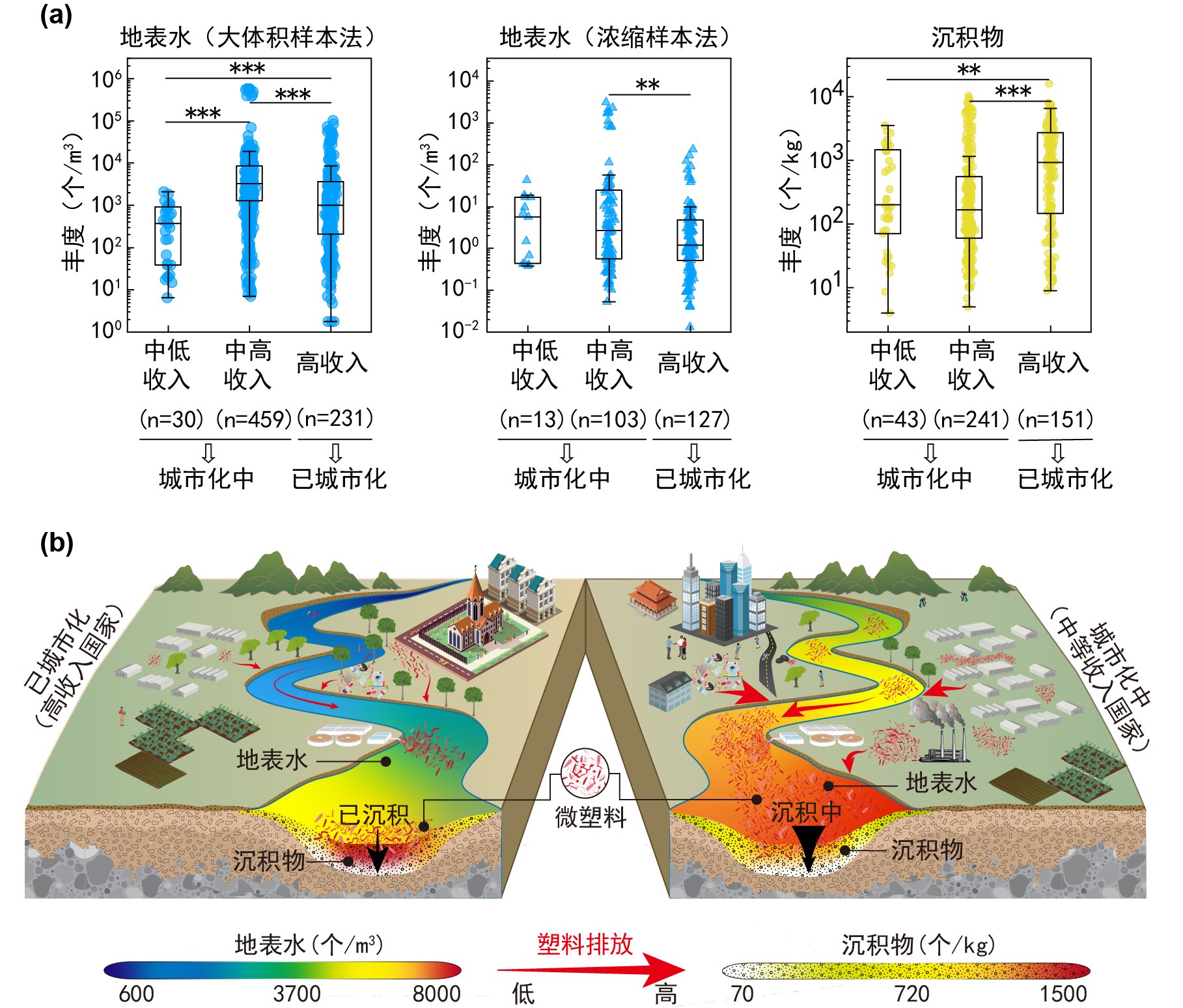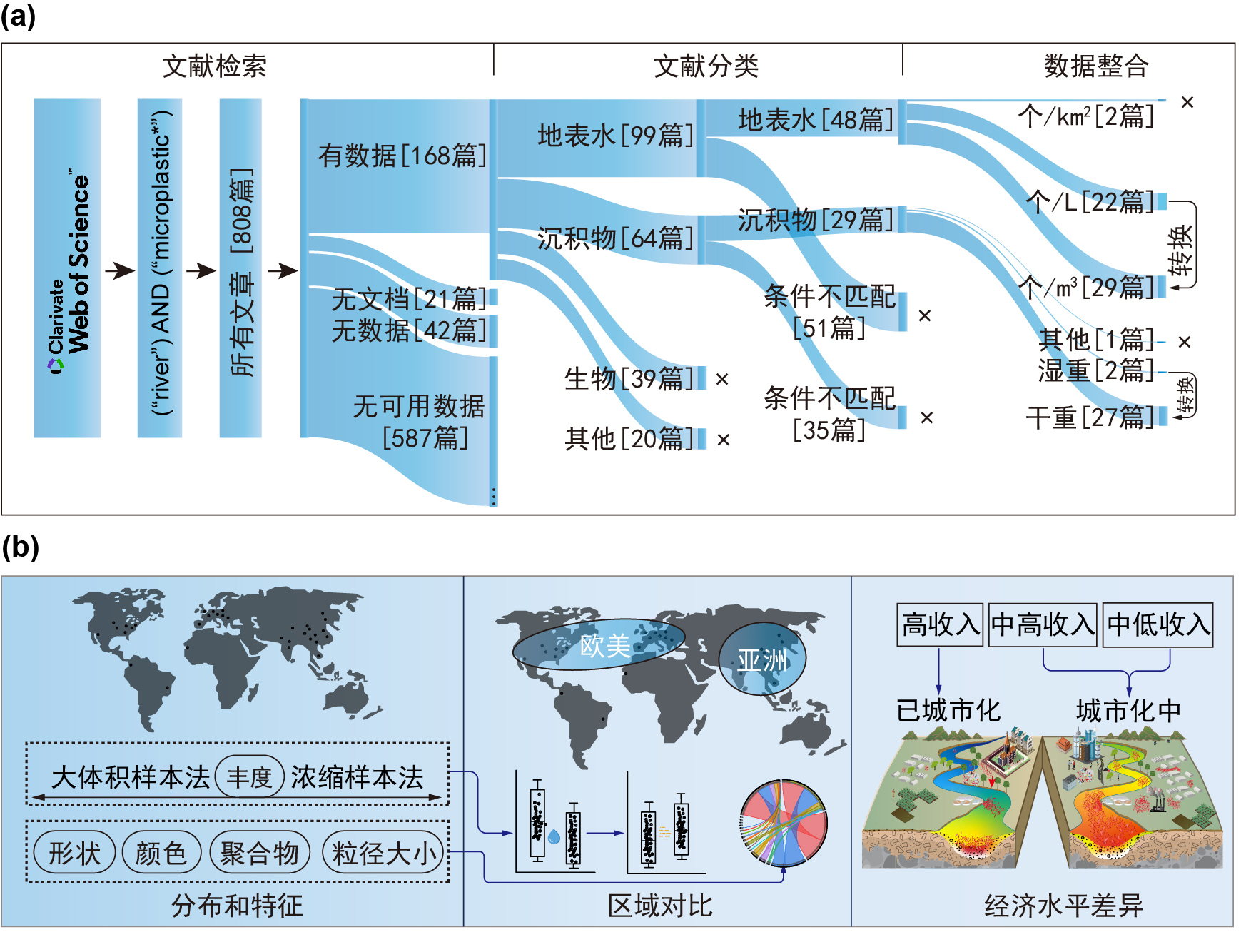 河流是微塑料颗粒从陆地向海洋传输的主要路径和存储库,对全球微塑料循环起着重要的环境和生态作用。由于环境条件、污染源和政策管理的差别,不同地区河流微塑料污染可能呈现空间差异。例如,微塑料污染的空间差异可以间接反映不同城市化进程中塑料污染防治能力和成效。然而,河流微塑料的研究方法不一致,在很大程度上造成了空间差异分析的不确定性。