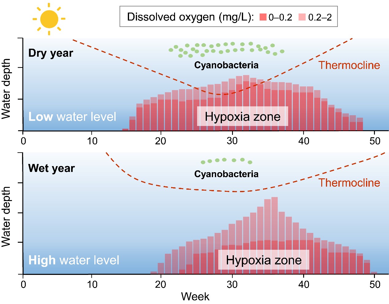 研究揭示了气候驱动的水位变化对亚热带季风区水库缺氧事件的影响,发现枯水年低水位期水库底层缺氧区提早形成的规律,加深了我们对气候变化背景下水库生态系统演变过程的理解和认知,有助于提高人类社会应对和适应气候变化的能力。研究结果不仅填补了全球气候变化下亚热带水库缺氧发生时间研究的空白,还为制定更加精准的水库水质管理和早期生态干预提供了科学依据。
