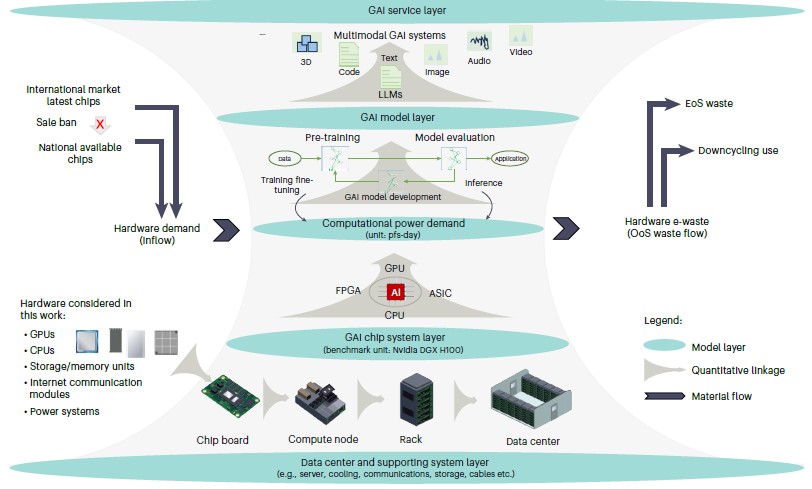 当前,以大语言模型为重要基础的生成式人工智能正在迅猛发展,并走进人们的日常生产及生活。然而,生成式人工智能需要庞大的计算算力及硬件资源,用来支撑大模型的训练和推理。因此,围绕生成式人工智能的硬件需求分析及其资源环境影响评估成为国际可持续发展领域重要议题和前沿挑战。其中,生成式人工智能对于电子废弃物的影响及其管理策略举措,仍未得以研究。