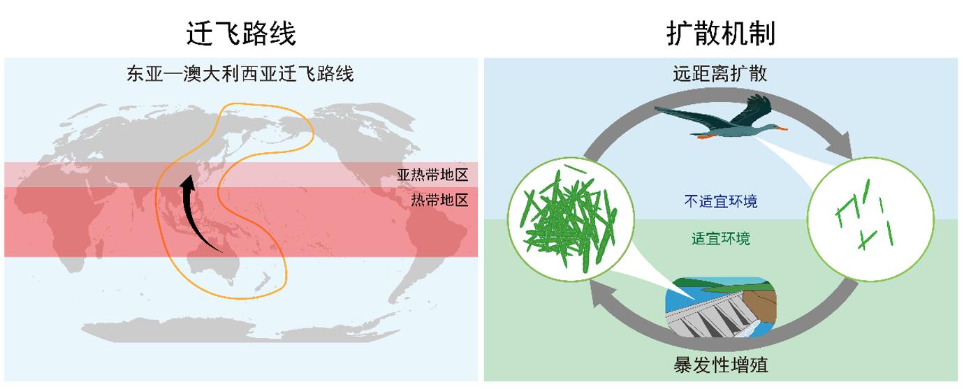 ????该研究证明了水鸟是拉氏尖头藻扩散传播的媒介,全球大规模修建的水库为拉氏尖头藻生长提供了适宜的环境条件。研究结果为拉氏尖头藻全球扩散与水鸟传播提供了新证据,加深了我们对拉氏尖头藻的全球扩散途径与传播机制的认知,为全健康(One Health)理念下拉氏尖头藻入侵和水华发生的早期预警防控提供了新思路。