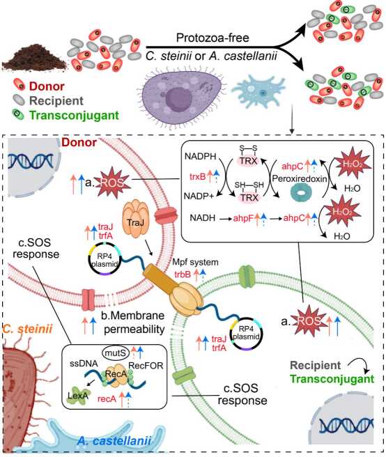 基于此,中国科学院城市环境研究所朱永官院士团队生物多样性与城市健康研究组以典型原生动物(Colpoda steinii 和 Acanthamoeba castellanii)为研究对象,综合利用荧光流式细胞分选、qPCR,宏基因组学和反转录定量 PCR等技术,深入解析了原生动物对质粒介导的抗性基因向微生物群落转移的驱动机制。研究发现,两种原生动物的捕食作用尽管降低了抗性质粒的绝对丰度,但促进了接合相关基因的表达,提高了抗性质粒向微生物群落中接合转移的频率。原生动物的捕食还改变了接合子的宿主范围,定向选择了接合子类群及其携带的抗性基因和毒力因子。研究揭示出原生动物捕食作用通过提高微生物群落的活性氧水平,增加膜通透性,诱发了SOS应答,调控了接合相关基因表达的上调,从而推动了质粒介导的抗性基因在群落水平的转移。本研究突出了环境抗生素耐药性传播背后微生物驱动力的重要地位,为理解环境抗生素抗性的传播开辟了新视角,为减轻抗生素耐药性传播环境健康风险提供重要的科学依据,是体现“同一健康”框架下人与自然和谐共生的重要抓手。