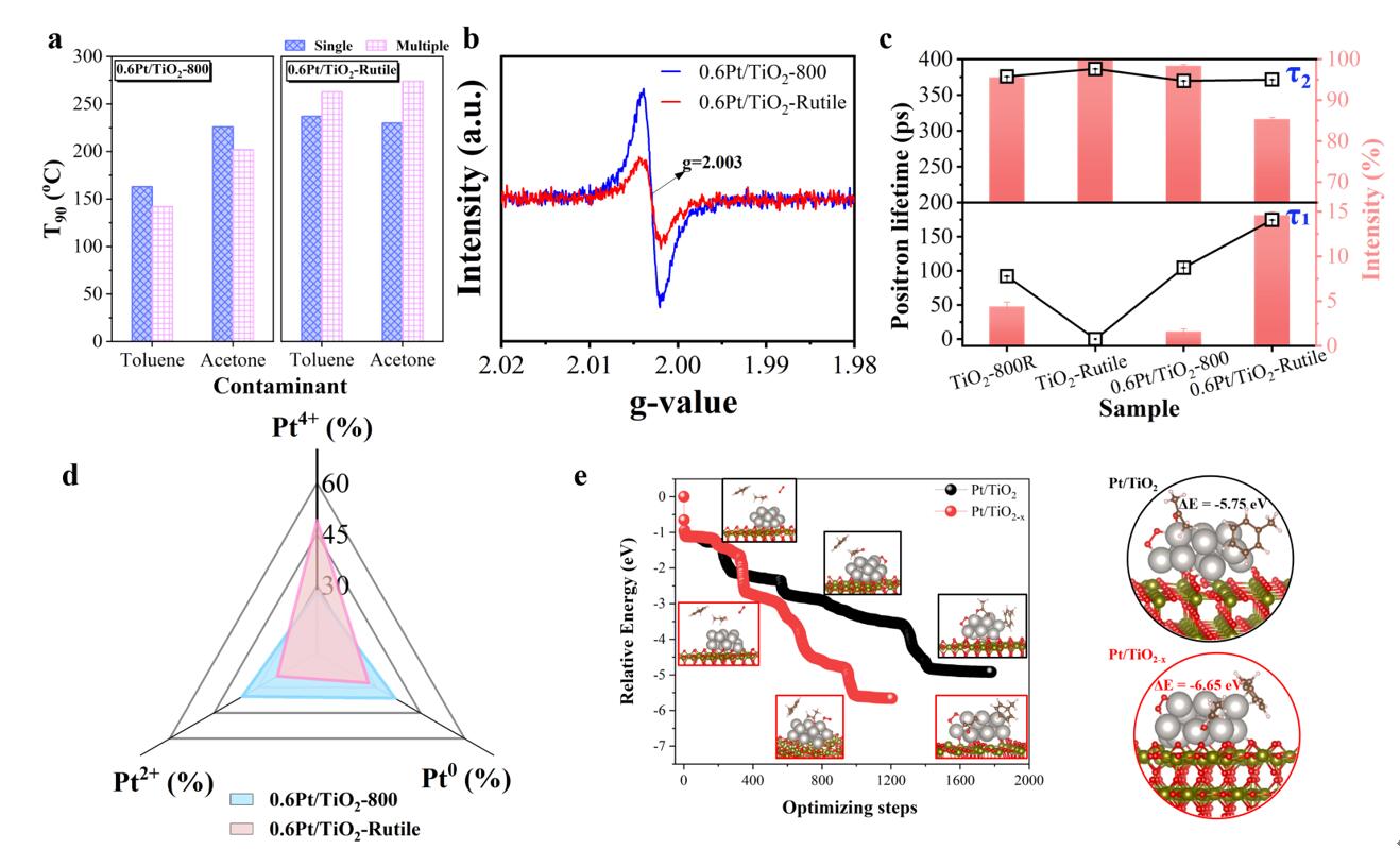 ????工业废气中多种挥发性有机物(VOCs)在催化燃烧过程中常因相互抑制效应导致净化效率下降,制约催化燃烧技术的推广应用。针对这一问题,研究团队采用载体缺陷调控方法(高温氢还原晶型转换TiO2载体,TiO2-800),成功构建了富含氧空位簇且贵金属与载体具有强相互作用的0.6Pt/TiO2-800催化剂。与传统0.6Pt/TiO2-Rutile(同晶型同贵金属负载)相比,0.6Pt/TiO2-800在常见甲苯、丙酮混合VOCs催化燃烧中,实现了从抑制效应到协同促进的逆转。通过实验联合理论计算表明,TiO2载体富集的氧空位簇促进了TiO2向Pt纳米颗粒转移电子,有效稳定了低价态Pt0物种,从而提升了催化活性。相较于完美TiO2载体,氧空位团簇调制的Pt颗粒更有利于VOCs和氧气的吸附活化。