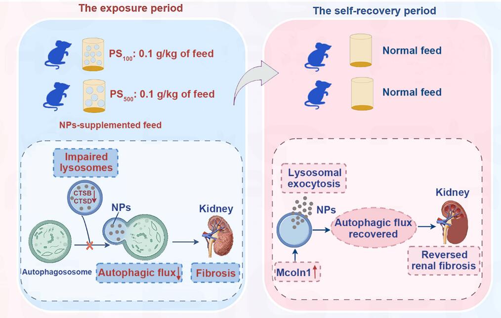 纳塑料暴露诱导肾纤维化及其可逆性机制示意图