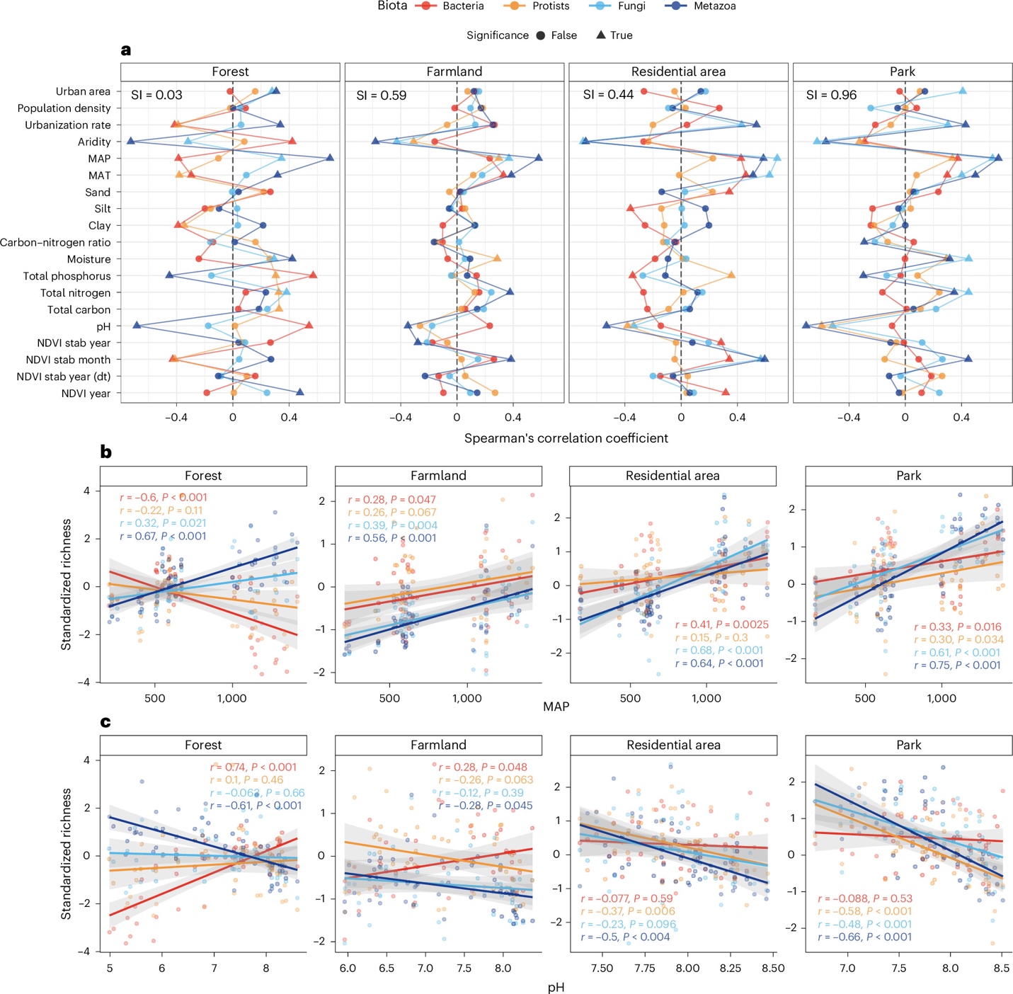 基于此中国科学院城市环境研究所朱永官院士团队孙新研究员领导的城市土壤生态研究组利用土壤eDNA技术,在大陆尺度上开展了一项覆盖我国13个城市、涵盖四种土地利用方式的土壤生物多样性与同质化效应及其驱动机制的研究。本研究发现,城市化增加了局地土壤生物多样性,但由于其导致的同质化效应,在区域、大陆乃至全球尺度上可能降低跨类群的生物多样性。具体而言:(1)与农田和森林相比,城市生态系统支持更高的局地土壤生物多样性(包括除了后生动物外的细菌,原生生物和真菌类群),且这种丰富度的提高与城市生态系统中较高的土壤pH值密切相关;(2)多数城市土壤生物群落比森林和农田表现出更加同质的特征,导致大尺度上的生物多样性降低;(3)这种同质化现象在一定程度上源于不同土壤生物类群对环境因子的同步响应,可能导致城市系统中土壤生物群落和功能的稳定性降低。该研究表明,在快速城市化进程中,亟需建立多尺度下土地利用、环境条件和土壤生物互作的综合认知框架,深入理解这些互作机制并制定针对性措施,对维持城市土壤的生态功能和服务及实现环境效益与人类福祉的双赢具有重要意义。