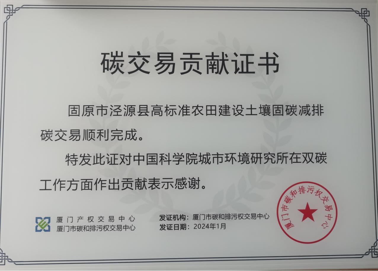 近日,厦门产权交易中心(厦门市碳和排污权交易中心)为城市环境研究所颁发了《固原市泾源县高标准农田建设土壤固碳减排碳交易》贡献证书。对城市环境研究所在助力全国首批“闽宁协作”农业碳汇交易成功落地作出的贡献表示感谢。